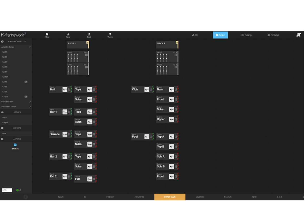 K-array K-framework3 是 K-array 自有的3D声学仿真软件和功放远程控制软件,支持MacOS和 Windows 两种操作平台系统,在这个软件中,可以完成空间区域的声场设计、仿真、配置和调试,确定扬声器的设计和摆位,可一键生成声场分析报告和将数据直接导入已连接的设备中,具体功能如下: